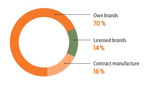 Midsona’s strategic goal is to work with brands that are number one or two in their markets. In 2021, own brands accounted for a total of 70 percent (69) of the Group’s sales. Many of our brands have strong and leading positions in selected segments in the respective product category.