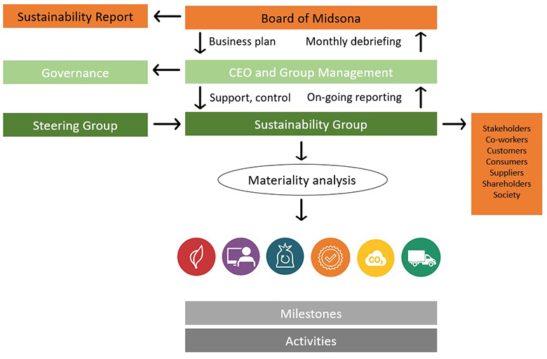 The Board of Directors has the overall responsibility for Midsona working with a realistic agenda for sustainable development and has assigned Group Management the task of setting the direction for and controlling Midsona's sustainability work.